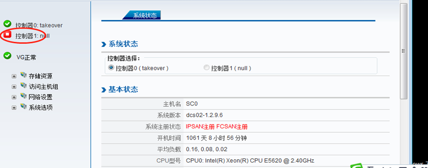 1、通过浏览器理软件检查,发现存储的一个控制器状态为NULL;其他正常。故障控制器的后端光纤指示灯,已经熄灭。判断该控制器已经故障离线。