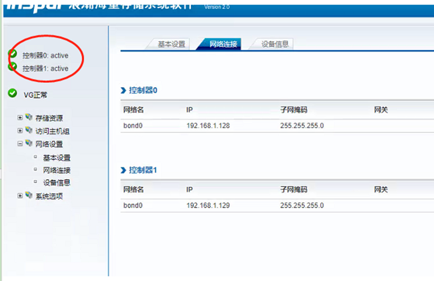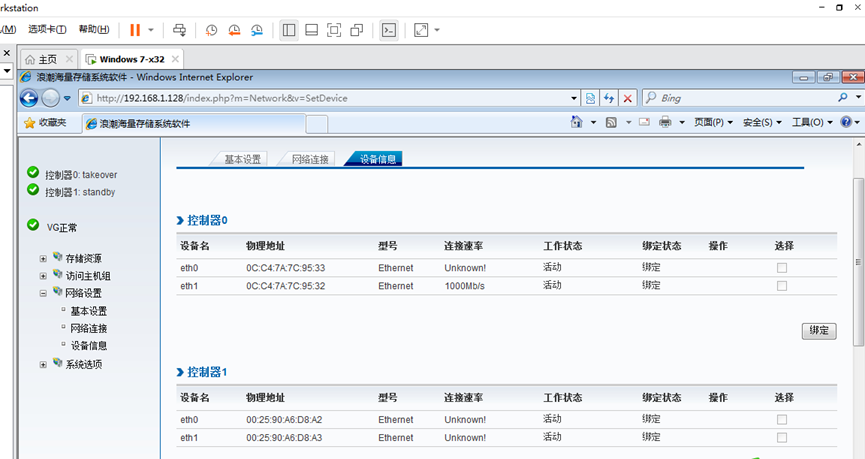 2、用笔记本连接正常的控制器。确定状态。 默认A 控制器:IP 192.168.1.128 B控 192.168.1.129 连接一个口即可。