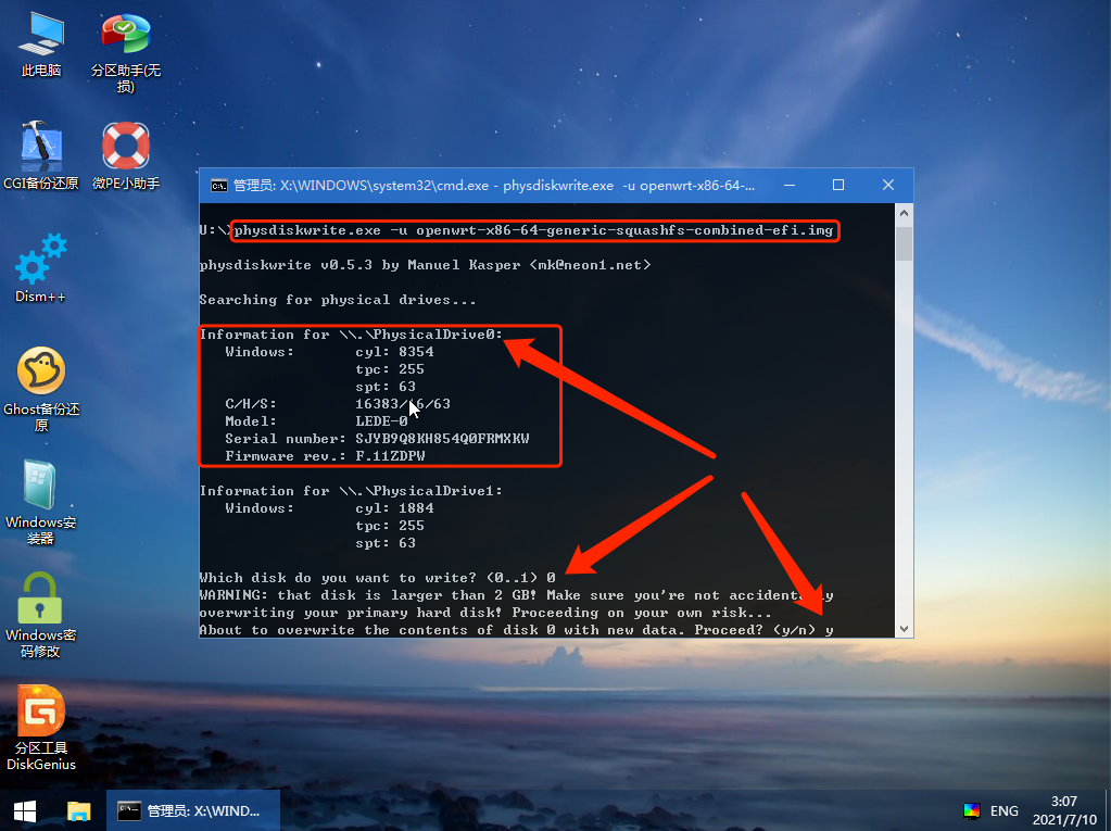 physdiskwrite.exe -u openwrt-x86-64-generic-squashfs-combined-efi.img这里的 physdiskwrite.exe -u 是固定的命令,后面的固件文件名需要写你自己的固件文件名,写几个字按 Tab 键就可以自动补全。